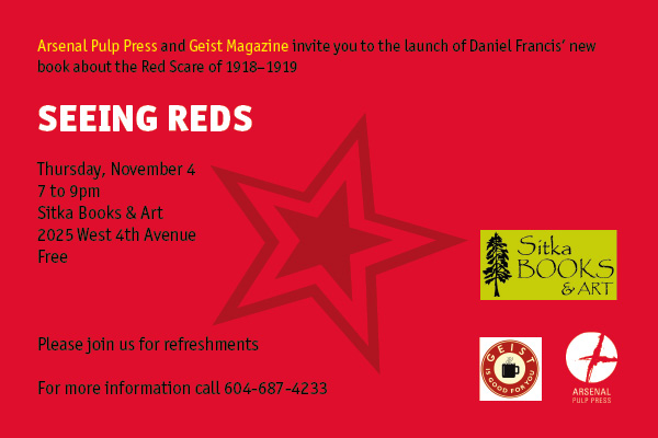 Arsenal Pulp Press and Geist Magazine invite you to the launch of Daniel Francis’ new book about the Red Scare of 1918-1919, Seeing Reds.