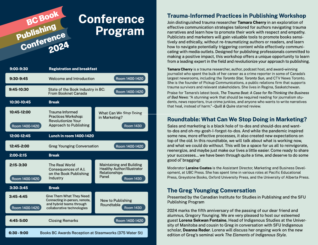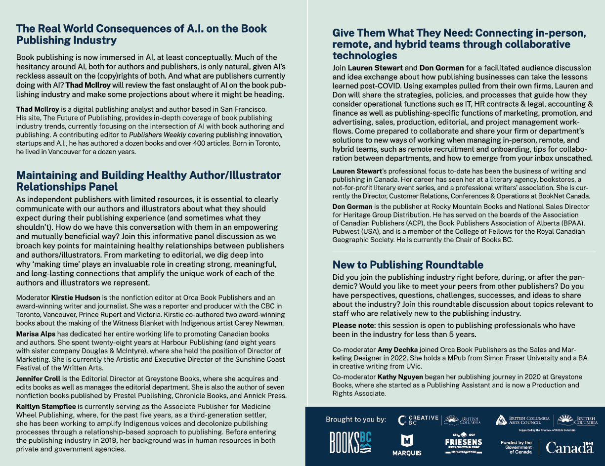 Did you join the publishing industry right before, during, or after the pandemic? Would you like to meet and socialize with your peers from other publishers? Do you have perspectives, questions, challenges, successes, and ideas to share about the industry? Join Greystone’s Kathy Nguyen (production and rights, joined the industry in 2020) and Orca’s Amy Dechka (marketing design, joined the industry in 2022) for a roundtable discussion about topics relevant to staff who are relatively new to the publishing industry. This session is open to publishing professionals who have been in the industry for less than 5 years; in order to create a welcoming environment where participants can speak candidly about their experiences, senior publishing professionals are discouraged from attending this session.