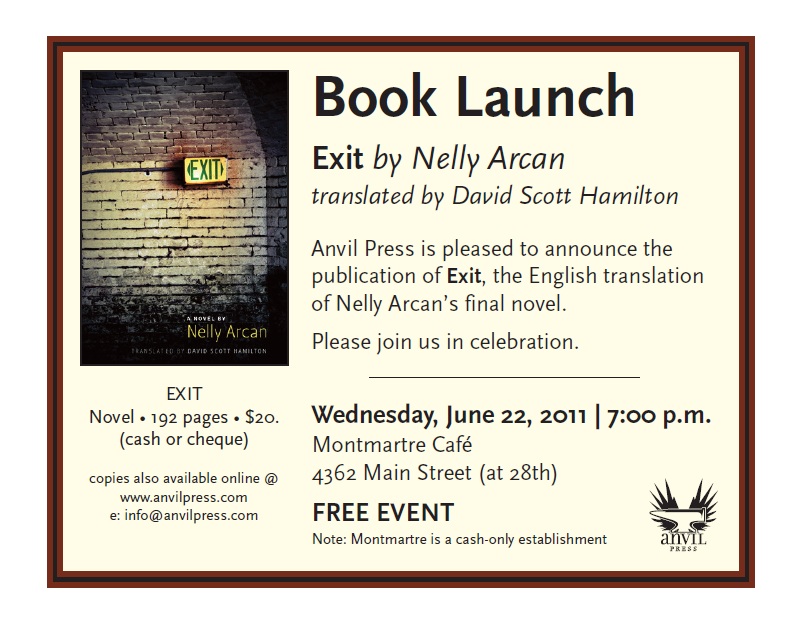 Anvil Press is pleased to announce the publication of Exit, the English translation of Nelly Arcan’s final novel. Please join us in celebration.