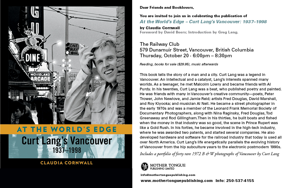 You are invited to join Mother Tongue Publishing in celebrating the publication of At the World’s Edge—Curt Lang’s Vancouver: 1937-1998.