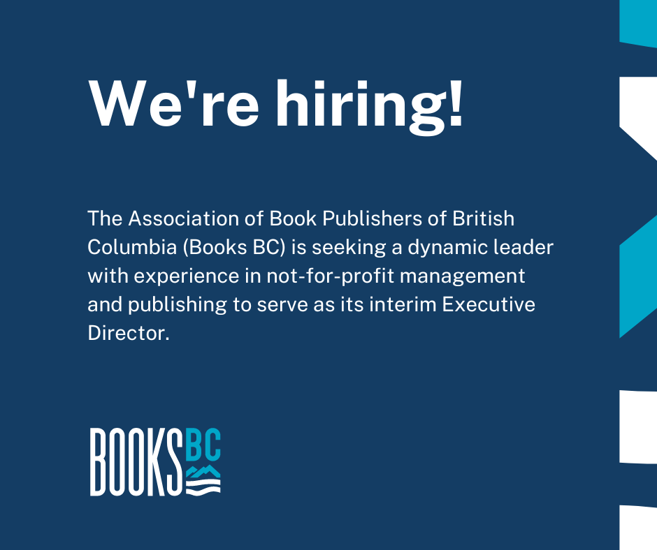 THE ASSOCIATION OF BOOK PUBLISHERS OF BRITISH COLUMBIA (BOOKS BC) is seeking a dynamic leader with experience in not-for-profit management and publishing to serve as its interim Executive Director. This is a 14-month, full-time position, based in Vancouver, BC. All Books BC staff currently work a hybrid schedule (mix of in-person and remote).