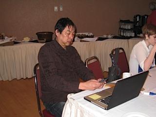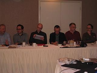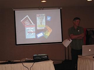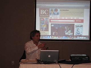 Alan Twigg, Chris Needham and Vicki Williams discuss Nadine Vassallo’s presentation: “Culling Data from the Book Industry Study Group.”Greg Younging prepares for his presentation: “Cultural Sensitivity in the Text.”Kerrie Waddington and Keiran Leblanc enjoy a glass of wine.Randal Macnair facilitates a roundtable on “The Current Big Challenges in Publishing.”Alan Twigg presents on BC BookLook.Publishers listen to an update from the Canada Council’s Catherine Montgomery, and the BC Arts Council’s Katherine Leong and Sheryl Jones.Alan Twigg and Ron Hatch partake in some post-dinner discussion.