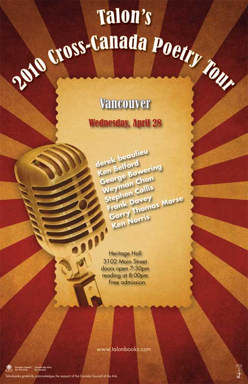 Poets: derek beaulieu, Ken Belford, George Bowering, Weyman Chan, Stephen Collis, Frank Davey, Garry Thomas Morse, and Ken Norris