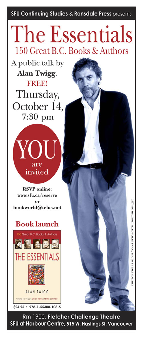 The Essentials, 30 years in the making, is a non-Oxford guide to B.C. literature highlighting 150 great books and authors from 1774 to 2010. SFU is sponsoring a public talk on October 14th. Anyone with an interest in the evolution of writing in Canada’s most literate province (according to federal surveys on per capital reading rates) can obtain a copy of this book by contacting Ronsdale Press at ronsdale@shaw.ca